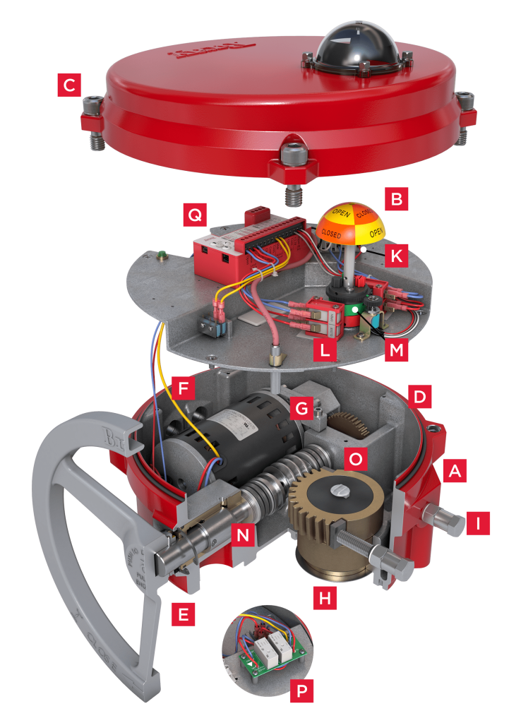 M. 限位开关凸轮:博雷的专利凸轮设计包括标配的绿色(打开)和红色(关闭)凸轮,可通过手指接触或螺丝刀进行调节,而无需使用其他工具。标准出厂设置允许打开和关闭位置之间的旋转角度为 90°。