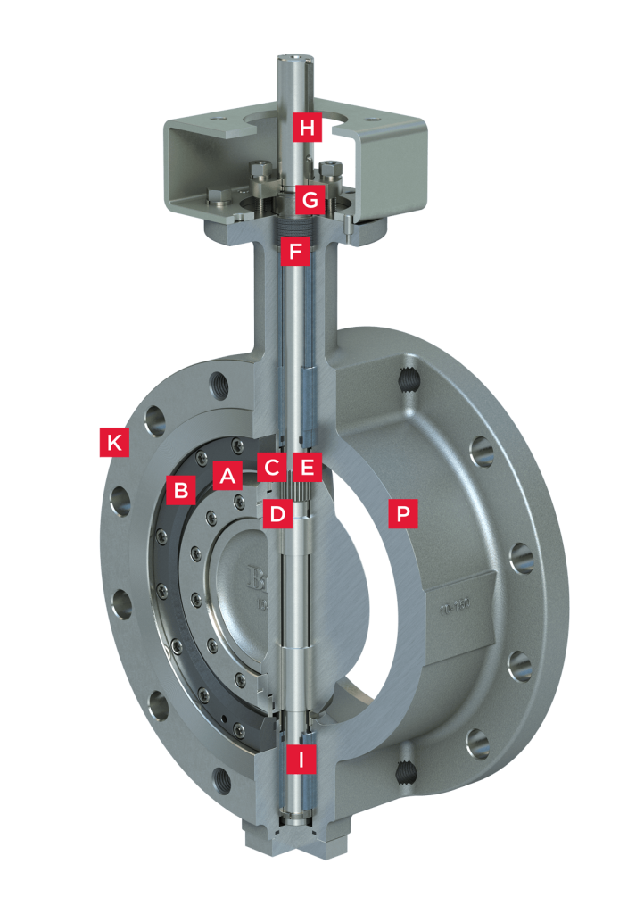 • **G. 坚固的防吹出阀杆:**单体阀杆在承压边界外侧配备了一个防吹出圈以及完全符合 API 609 和安全要求的冗余防吹出机制。