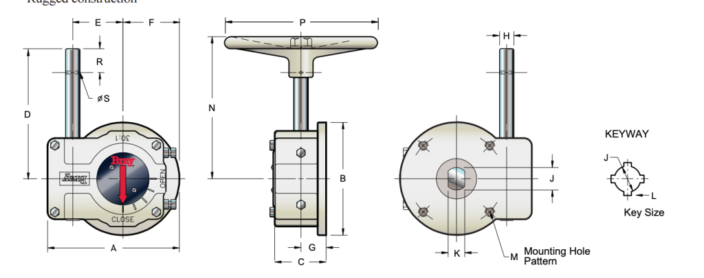 Bray 博雷阀门推出适用于 2″ – 48″ (50mm – 1200mm)重载开/关和限流应用阀门的 Bray 博雷 04 系列手动齿轮操作器。04 系列可进行自润滑,使操作平稳、无故障。坚固的铸铁阀体带有 O 型圈阀杆填料,使防风雨级别达到 IP65。自锁蜗杆和蜗杆齿轮传动装置将阀门保持在所需位置。其特点是,带有一个方便操作的手轮、一个阀门位置指示器、和多个机械行程止动件,可现场将阀门移动调整至特定的旋转角度。可选配链轮配件、挂锁套件和 2″方螺帽版本。也可为 1″ – 16″尺寸的阀门提供带有不锈钢外壳的齿轮操作器。