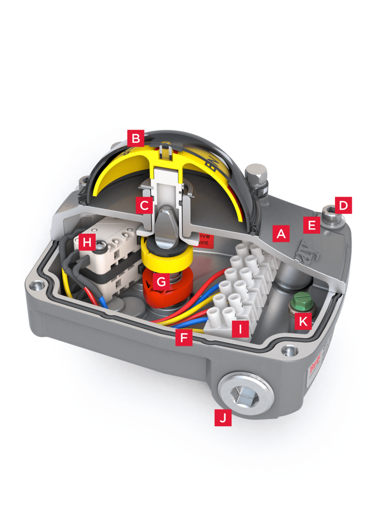 Bray 博雷提供单凸轮或双凸轮用于每个独立/主开关。双叶在切换时,S5B 中提供了凸轮配置可能包括辅助开关。双凸轮将激活主凸轮和同时辅助开关凸轮安装在指示轴上,交替介于红色和黄色之间,并且是独立的可手动调节,增量为 3.6°。没有特别的此调整需要工具。自锁设计确保凸轮不会打滑位置。底部的红色凸轮用指示关闭底部黄色凸轮时的位置以指示未平仓头寸。两个开关与这些凸轮相关的标记也相应地。可以安装额外的红色和黄色凸轮在 S5B 中,可用于中途行驶位置指示或提供额外的辅助打开和关闭指示。中行程开关未标记。